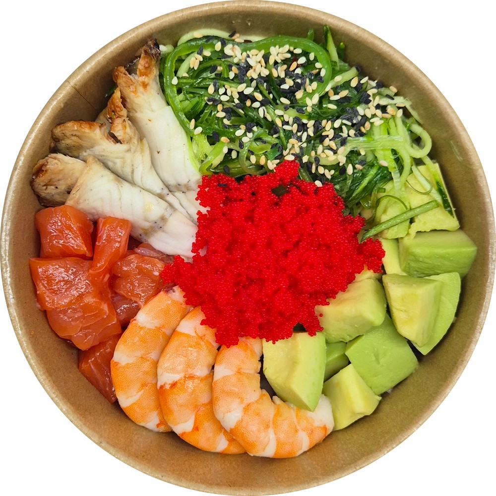 Лосось, креветка, вугор, авокадо, масаго, огірок, унагі, чука, кунжут, соус спайсі, рис