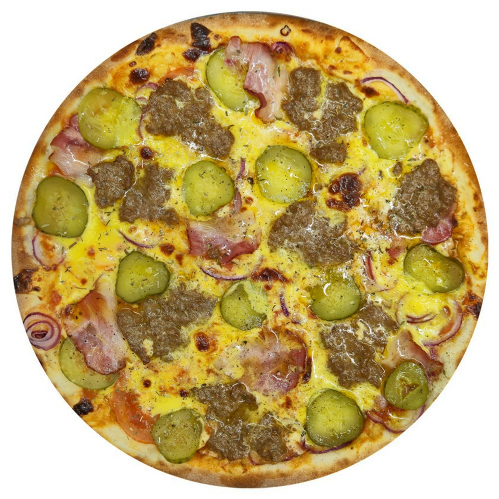 Червоний соус, мисливські ковбаски, солодка цибуля, помідори, болгарський перець, мариновані огірки, голландський сир, моцарела, маслини/оливки, свіжа зелень, бургерний топінгДодати смачний соус😋