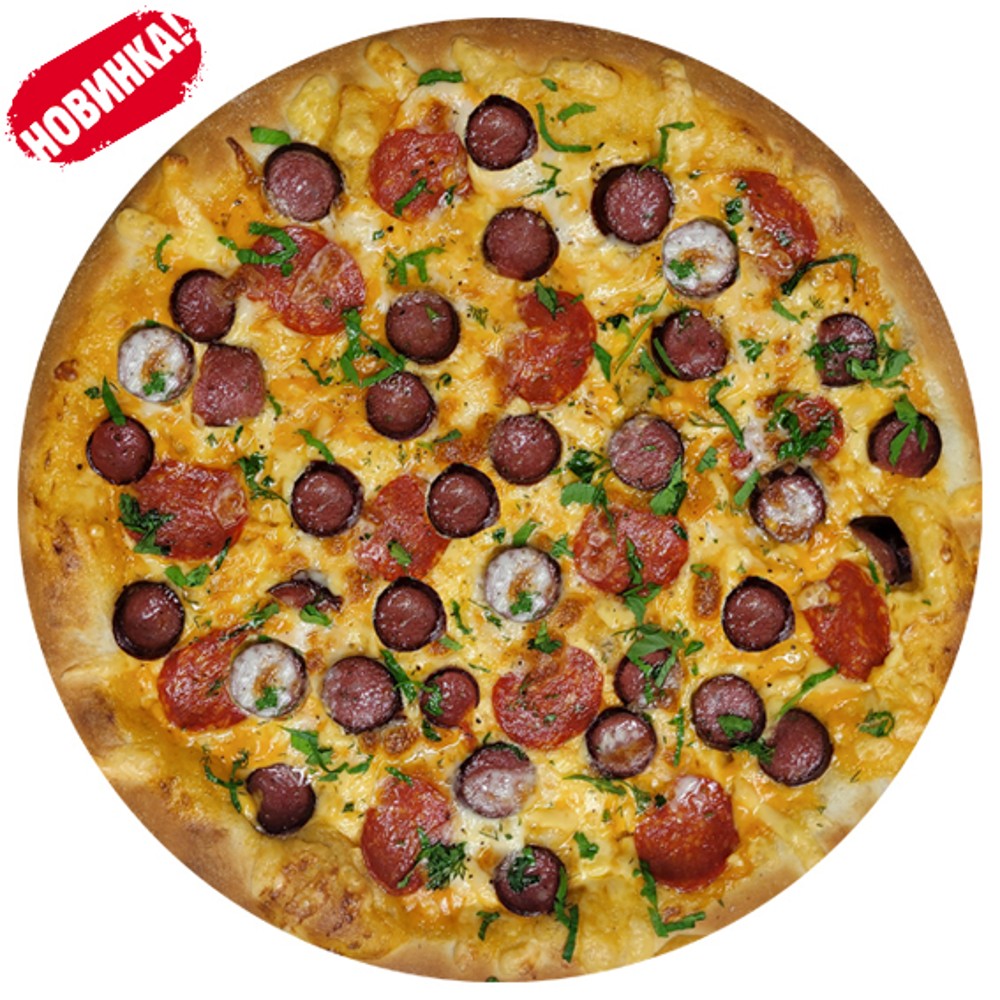 Білий соус, духмяний бекон, мисливські ковбаски, солодка цибуля, моцарела, голгандський сир, свіжа зеленьДодати смачний соус😋